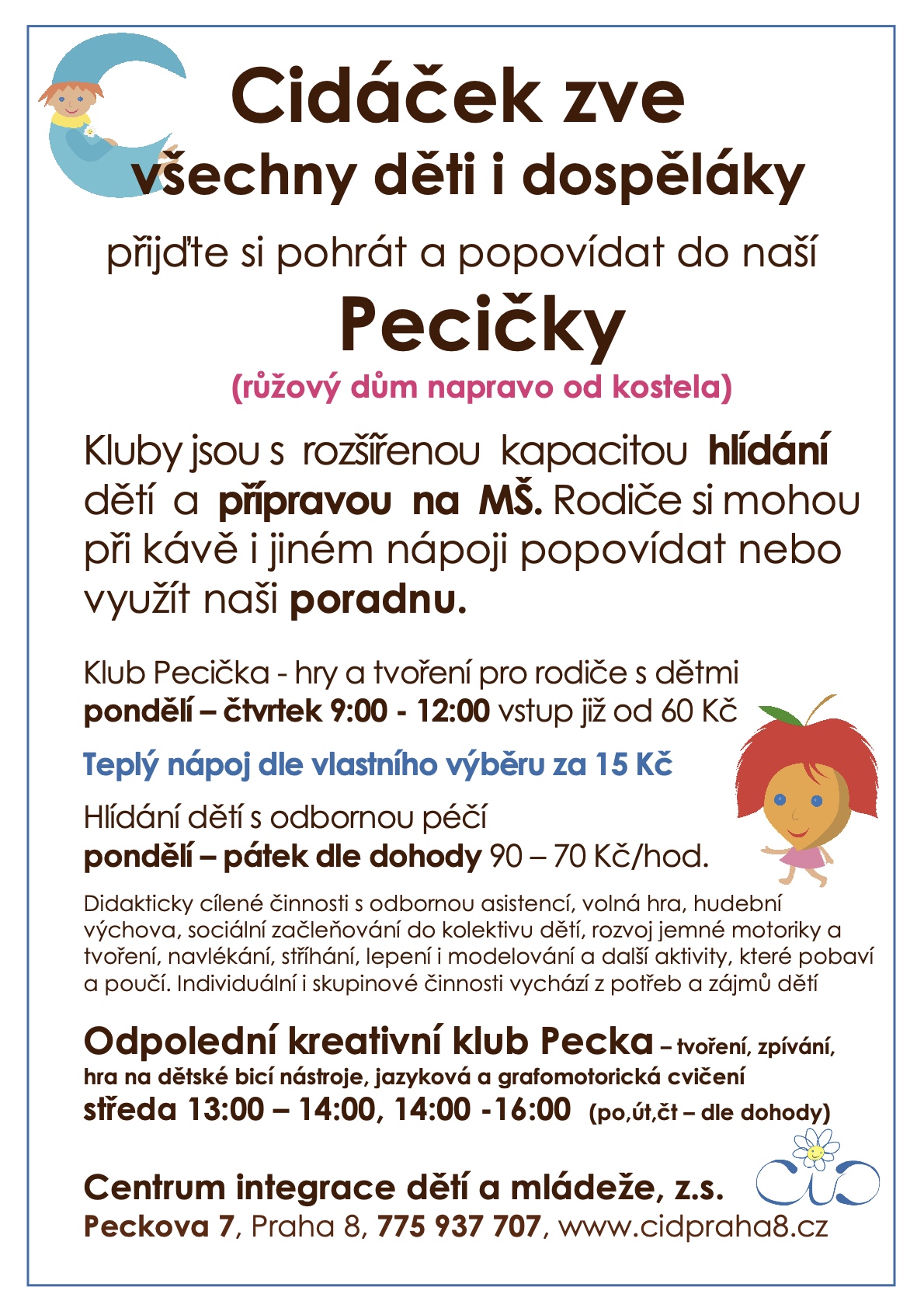 Skřítek Cidáček zve všechny děti i dospěláky. Přijďte si pohrát a popovídat do naší Pecičky!