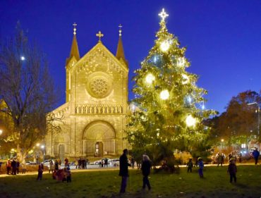 Ode dne 23. 11. 2020 svítí vánoční strom na Karlínském náměstí.